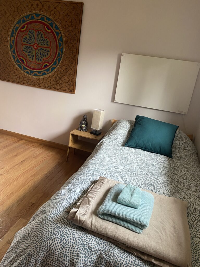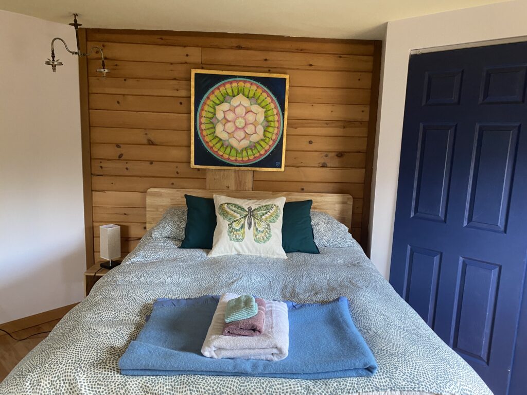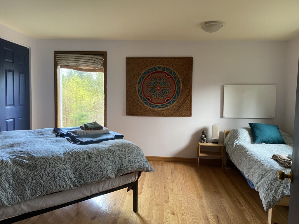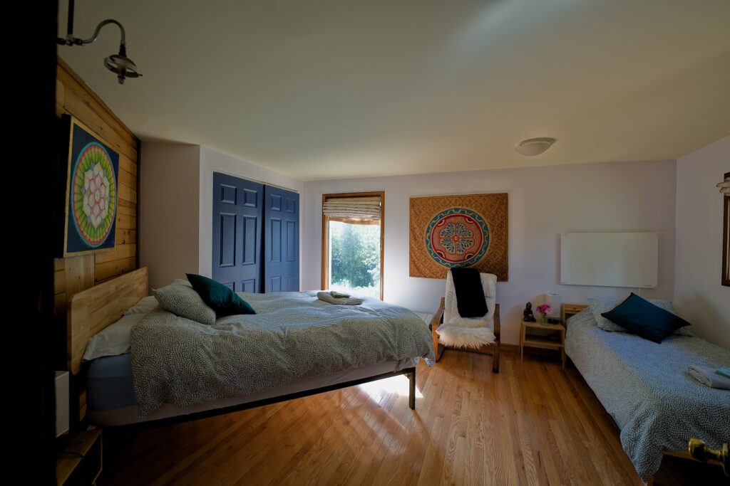 This bright, light, and quiet room in the main house at Star River Sanctuary has 1 queen bed and 2 twin beds. Next to shared den, tea station area, bathroom, and infrared sauna. It's a sweet space to share with family and friends. Cats do live in the house:)