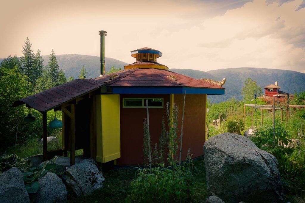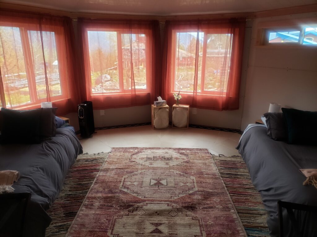 The Earth Temple is a 9 sided shared space that sleeps 2 people with twin beds. There is access to the toilets and showers in the Upper retreat area close by.