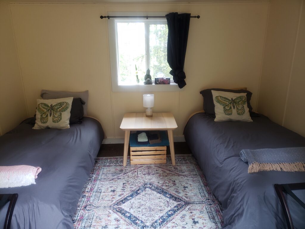 This is a sweet cozy cabin room in the forest retreat area of Star River. Each cabin room has 2 Twin beds, electric heat, and protection from the elements. These rooms are quiet, peaceful, and perfect for more mellow personal space.